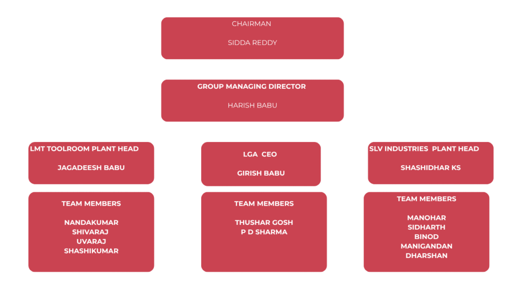 Our organization is led by Chairman Sidda Reddy and Group Managing Director Harish Babu. Key plant heads include Jagadeesh Babu (Toolroom), Girish Babu (CEO, LGA), and Shashidhar KS (SLV Industries). The team works collaboratively to deliver quality manufacturing and engineering solutions.”